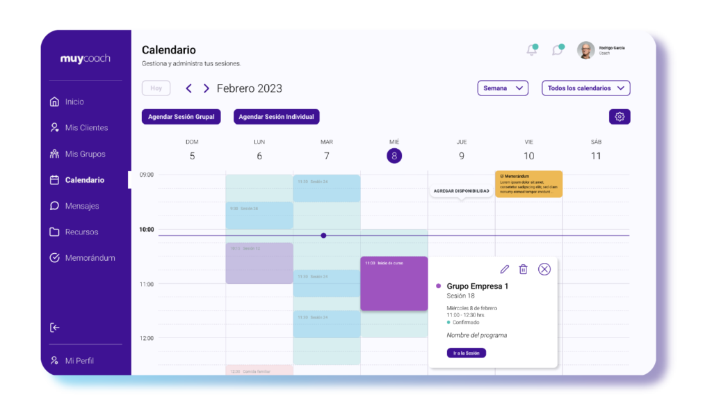 El calendario MuyCoach se sincroniza con tu calendario preferido (google, outlook, ical), lo que te permite una experiencia de programación fluida y sin estrés. Todo comienza contigo configurando tu disponibilidad para que tus clientes puedan reservar sus sesiones de forma independiente y evitar crear reservas dobles o colisiones de eventos. En caso de que necesites cancelar una sesión programada, puedes hacerlo fácilmente desde tu calendario.