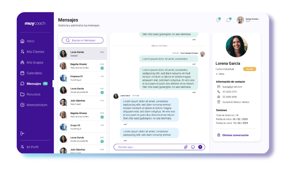 Sigue en contacto con tus clientes para fomentar conexión y alineación durante todo el programa. El chat integrado de MuyCoach te permite enviar y recibir mensajes dentro de la plataforma. Las notificaciones te avisarán cuando llegue un nuevo mensaje, para que puedas mantener viva la conversación entre sesiones.