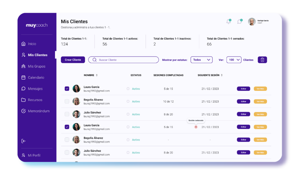 Visualiza todos tus compromisos Individuales y Grupales en una sola página. Revisa el progreso y estado de las sesiones de cada uno de tus clientes. Crea nuevos programas e invita a nuevos clientes a unirse a la plataforma MuyCoach. Cierra compromisos y almacena esta información como referencia para futuros programas.