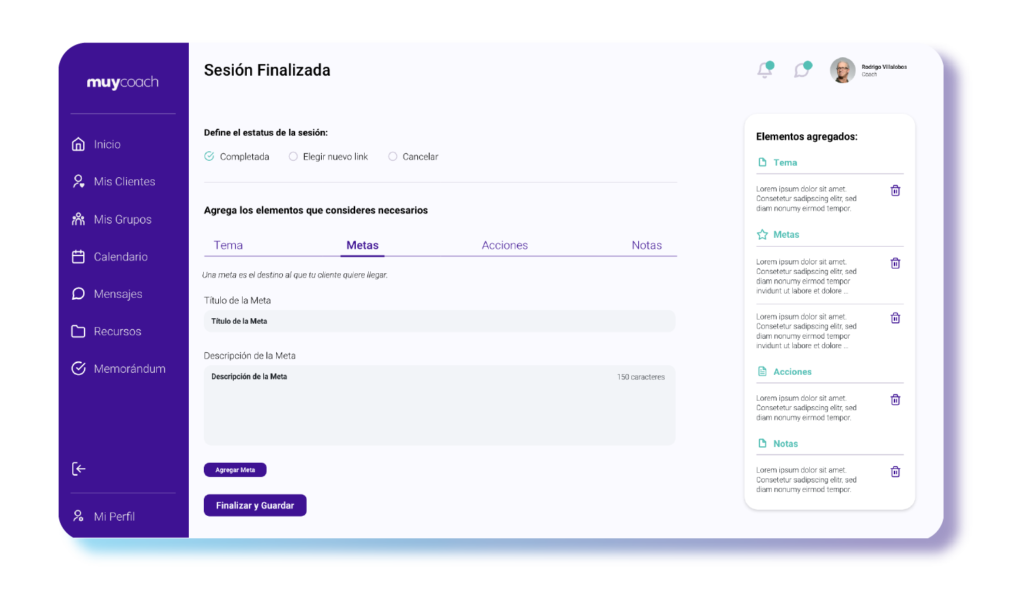 Con MuyCoach vas a poder crear un resumen de cada sesión así que todo lo que trabajas con tus clientes se queda en un solo lugar, seguro y fácil de encontrar. Por ejemplo, ¿Cuál fue el tema tratado? ¿Qué se quería lograr? ¿Cuál fue el desafío del cliente? ¿Cuál fue la acción concordada? ¿Compartiste recursos? Esta información permanece guardada y podrás consultarla fácilmente para prepararte antes de volver a trabajar con tu cliente.